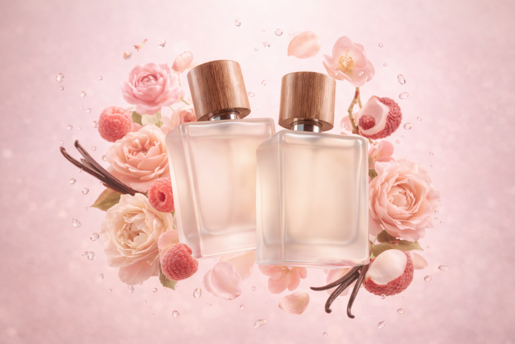 Les notes classiques comme la rose et le jasmin sont revisitées avec des touches fruitées ou boisées pour un résultat plus contemporain.